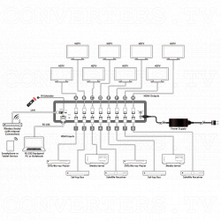 - Input Ports: 8 x HDMI; 1 x IR (3.5mm); 1 x RS-232 (9 pin D-sub); 1 x Control (RJ-45); 1 x USB (Service only); 1 x 24vDC PSU